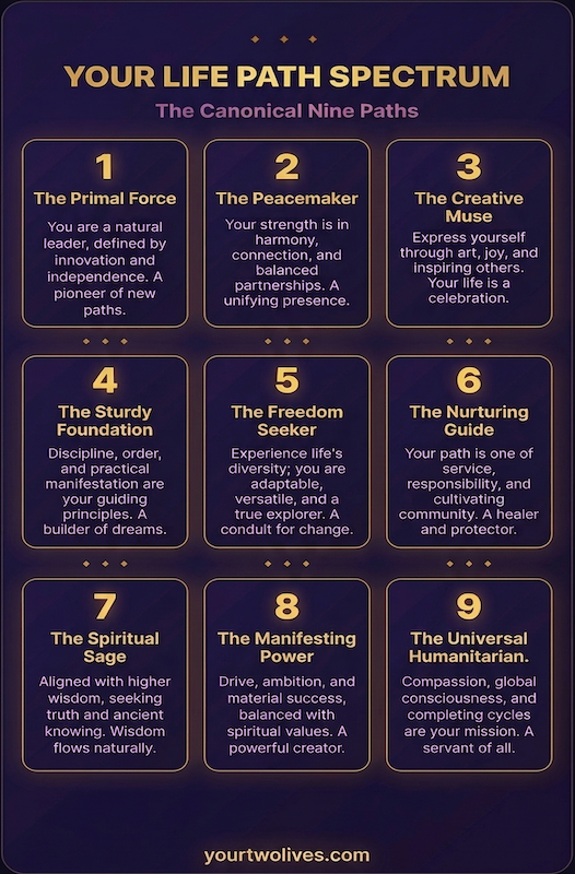 There are nine canonical Life Path Numbers, each representing a distinct archetypal journey. You are one of these. Understanding yours is the first step to understanding why you're here.
